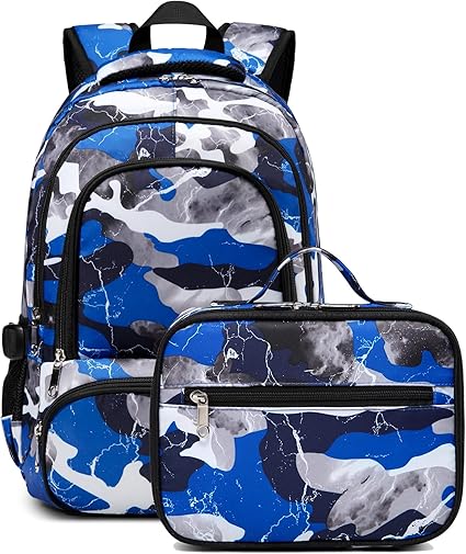 BLUEFAIRY Boys Backpack with Lunch Box for Kids Elementary Middle School Bags Set Child Book Bags Back to School Gifts Mochila Escolar para Niձos Adolescentes Camo Blue