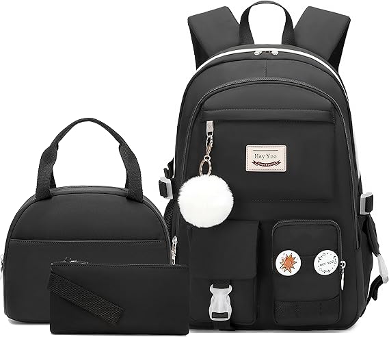 Hey Yoo School Backpack for Girls Backpack with Lunch Box Teen Girl Backpack Set Cute School Bag Bookbag for Teen Girls (Black)