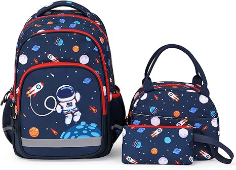 School Backpack Kids Bookbag Set-with Lunch Bag & Pencil Case Elementary Preschool Kindergarten Supplies for Boys Large Capacity Backpack Set (Dark Blue Space)