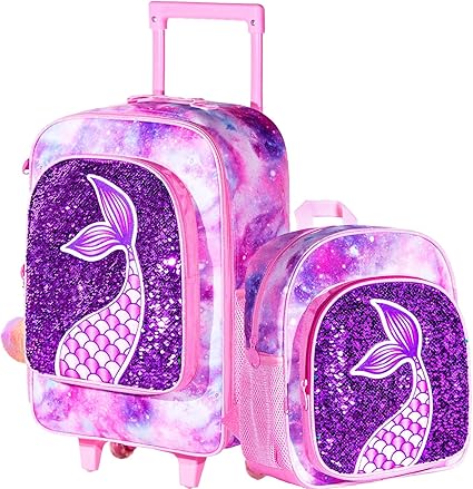 2PCS Kids Luggage, Suitcases for Girls, Carry on Rolling Luggage with Wheels, 18" Toddler Suitcase Set 12" with Sequin Backpack - Pink Mermaid