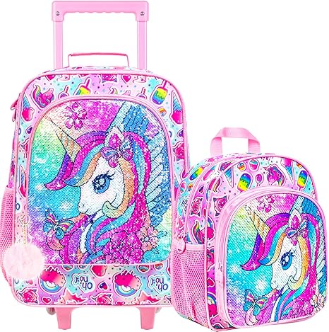 2Pcs Kids Suitcase for Girls, Carry on Rolling Luggage with Wheels, Unicorn Sequin Travel Suitcases Set with Toddler Backpack(Pink)