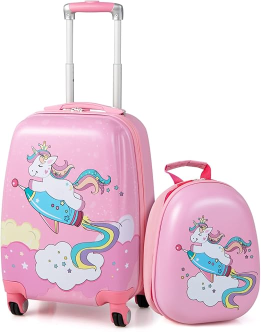 GYMAX 2Pc Kid Carry On Luggage Set, 12" & 18" Kids Suitcase with 4 Spinner Wheels, Travel Rolling Trolley