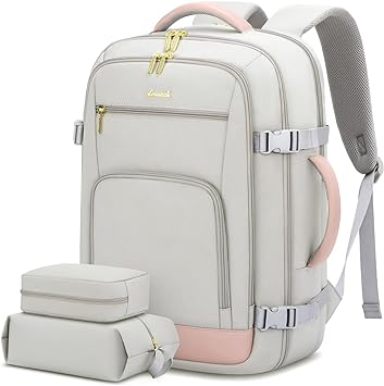 LOVEVOOK Travel Backpack For Women, 40L Carry On Backpack Flight Approved, TSA Personal Item Travel Bag Fits 17 Inch Laptop, Business Weekender Overnight Waterproof Daypack With 2 Cubes, Grey-Pink