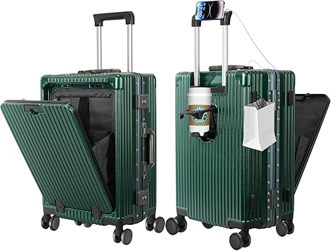 Aluminum Frame Luggage with Cup Holder and Usb Port, Front Compartment, TSA Lock, Airline Approved Hardside Suitcase with Spinner Wheels(Green 24-lnch)