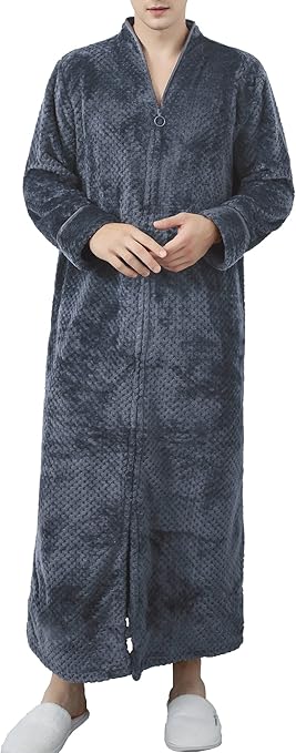 Locachy Men's Flannel Zip Bathrobes Soft Warm Long Fleece Plush Robe Housecoats Nightgown Sleepwear