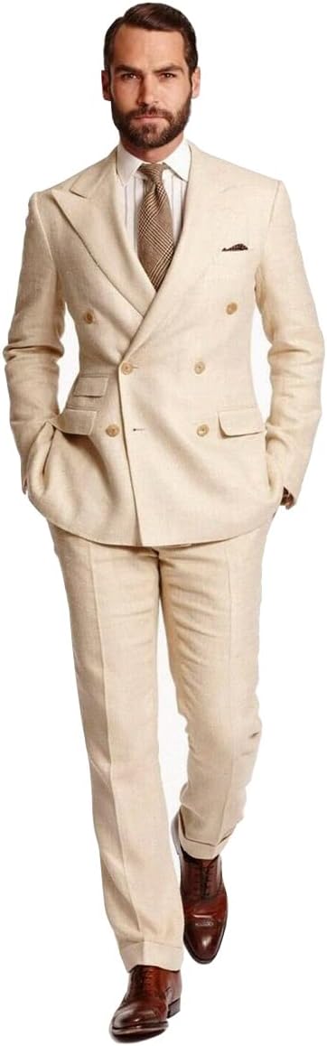 Double Breasted Men's 2 Pieces Beige Linen Tuxedos Prom Business Casual Suits Blazer Pants