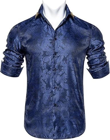 DiBanGu Navy Blue Dress Shirts for Men Woven Silk Paisley Formal Casual Shirt Long Sleeve for Business Party S-4XL Size