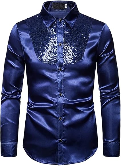 Mens Shiny Sequins Silk Satin Dress Shirts Long Sleeve Button Up Shirt Men Disco Party Stage Singer Prom Male Shirt