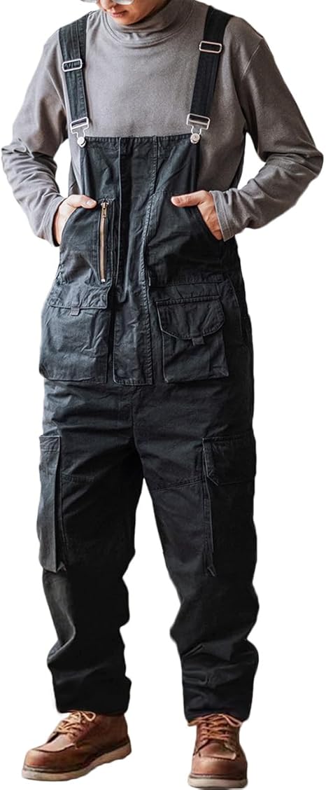 Rexcyril Men's Fashion Bib Overalls Baggy Loose Fit Casual Workwear Lightweight Sloppy Coveralls with Cargo Pockets, Black, 38