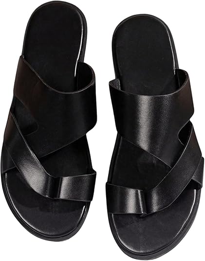 GORGLITTER Men's Beach Leather Sandals Slide Footwear Round Flip Flops Pu Leather Slippers