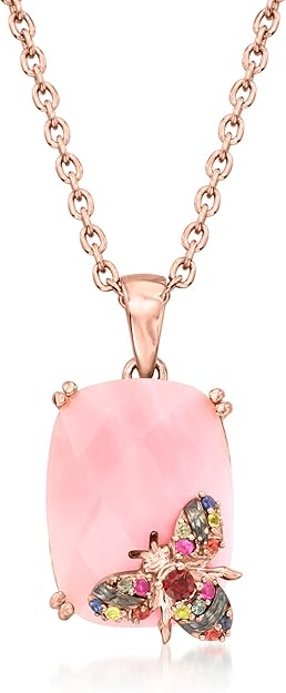 Ross-Simons Pink Opal Bumblebee Pendant Necklace With .10 ct. t.w. Multicolored Sapphire and Garnet Accent in 18kt Rose Gold Over Sterling. 18 inches