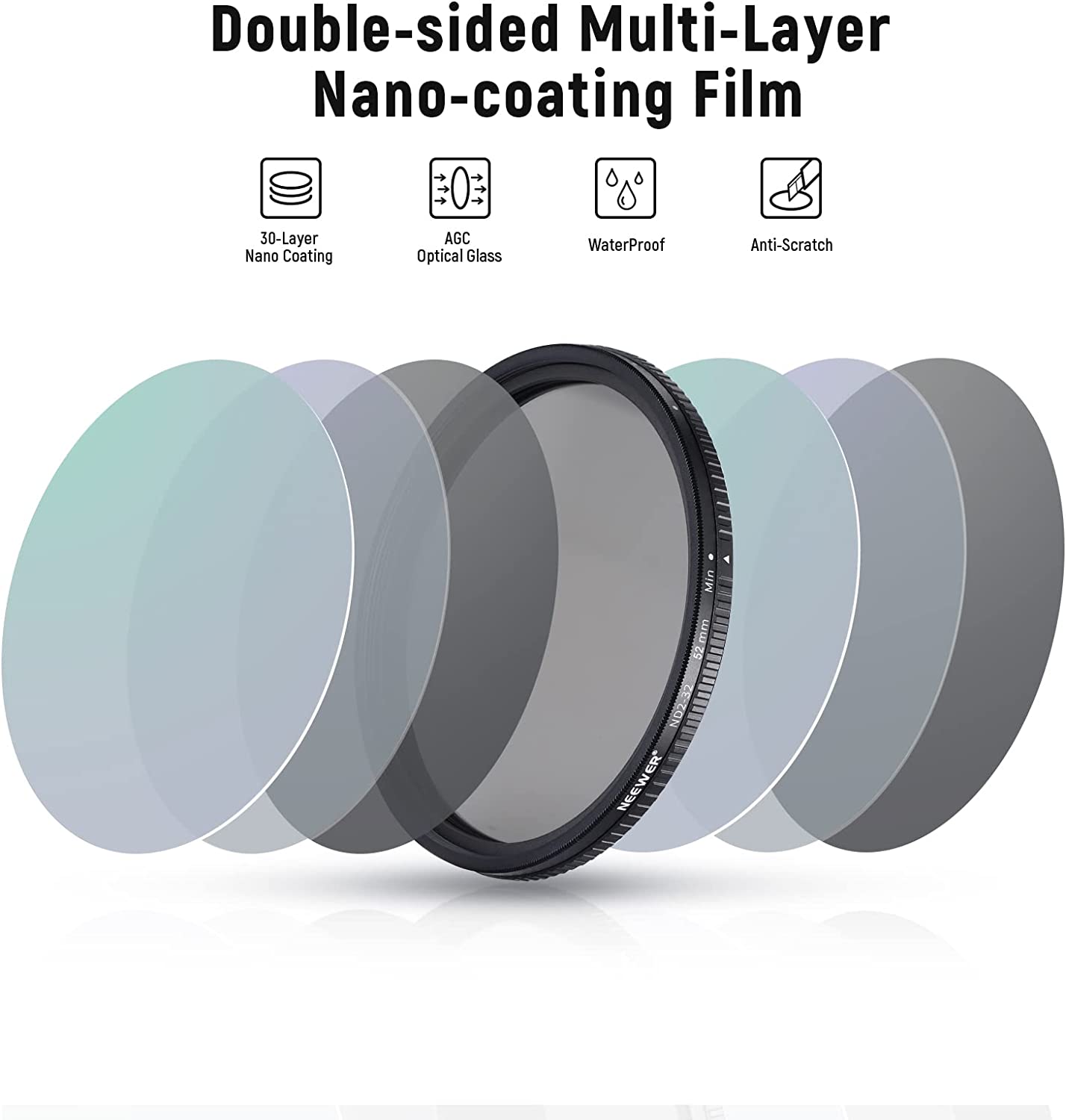 • 【1-5 Stops Variable ND Filter】 The NEEWER ND2-ND32 Variable Filter is adjustable from 1 to 5 stops, with a rotating ring to reduce light intake and extend exposure time when shooting at slower shutter speeds and wider apertures. Perfect for capturing rivers, waterfalls, light trails and other moving subjects with dynamic motion blur.