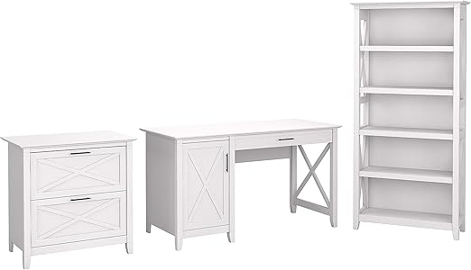 Bush Furniture Key West 54W Computer Desk with 2 Drawer Lateral File Cabinet and 5 Shelf Bookcase in Pure White Oak
