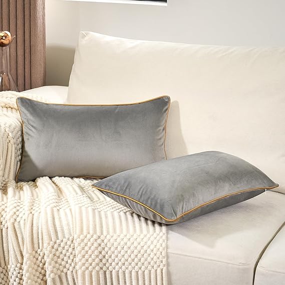 Aeckself Pack of 2 Luxury Velvet Gray Lumbar Pillow Covers 12 x 20 Inch, Modern Decorative Pillowcase with Gold Trim Edge, Comfortable Soft Solid Cushion Case for Couch Bedroom Living Room