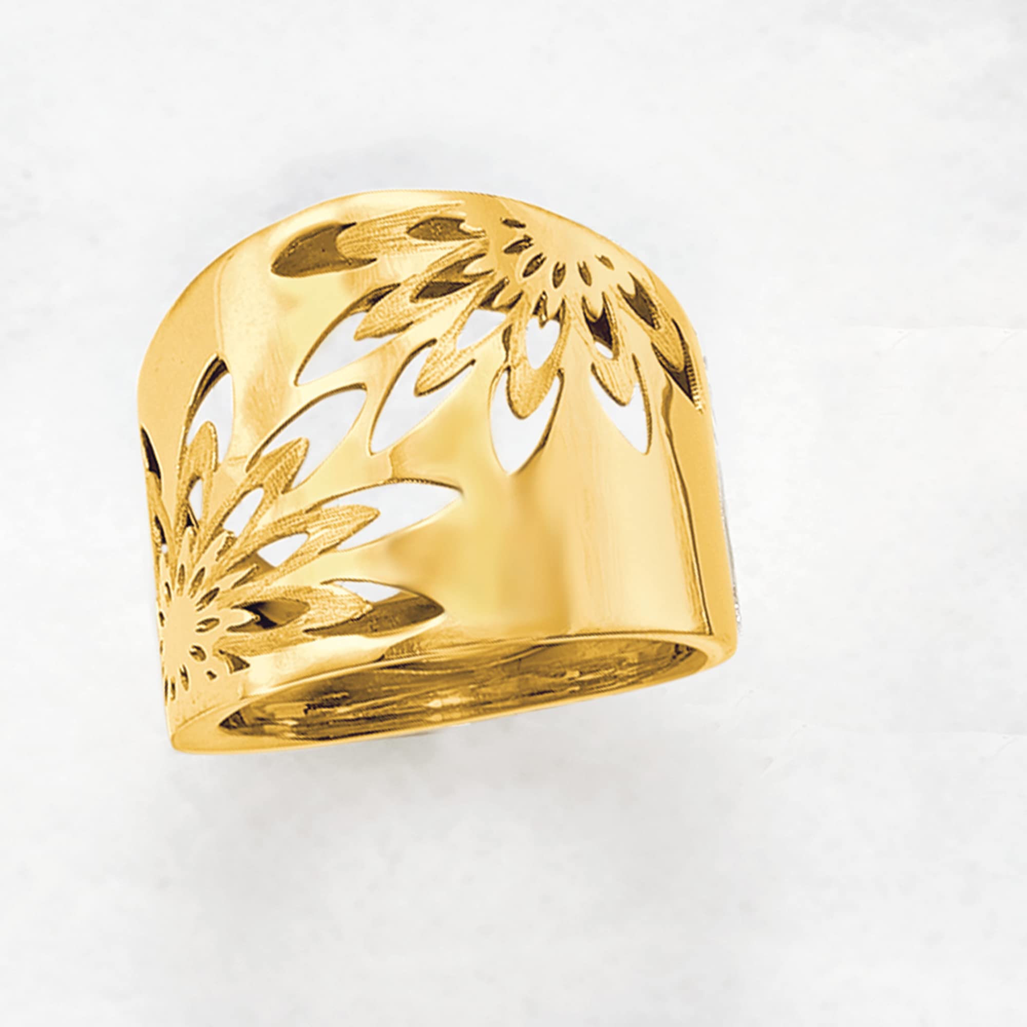 Details: Established in 1952, Ross-Simons presents contemporary styles with a timeless appeal. Charming cutout flowers adorn this wide 14kt yellow gold ring from Italy. Brushed and polished finishes bring depth to the openwork design. 3/4" wide. 14kt yellow gold floral ring.
