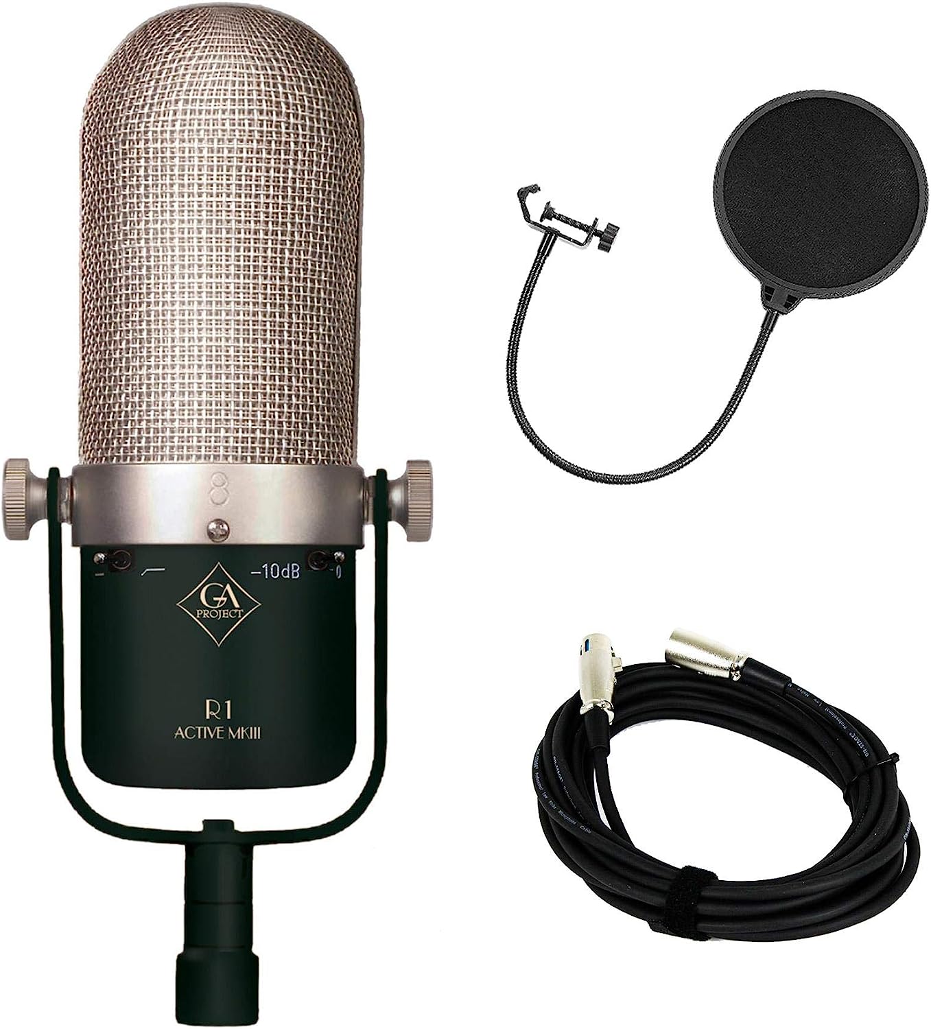 This bundle includes the Golden Age Project R1 Active MK3, 20-foot XLR Cable, and a Nylon Gooseneck Pop Filter.