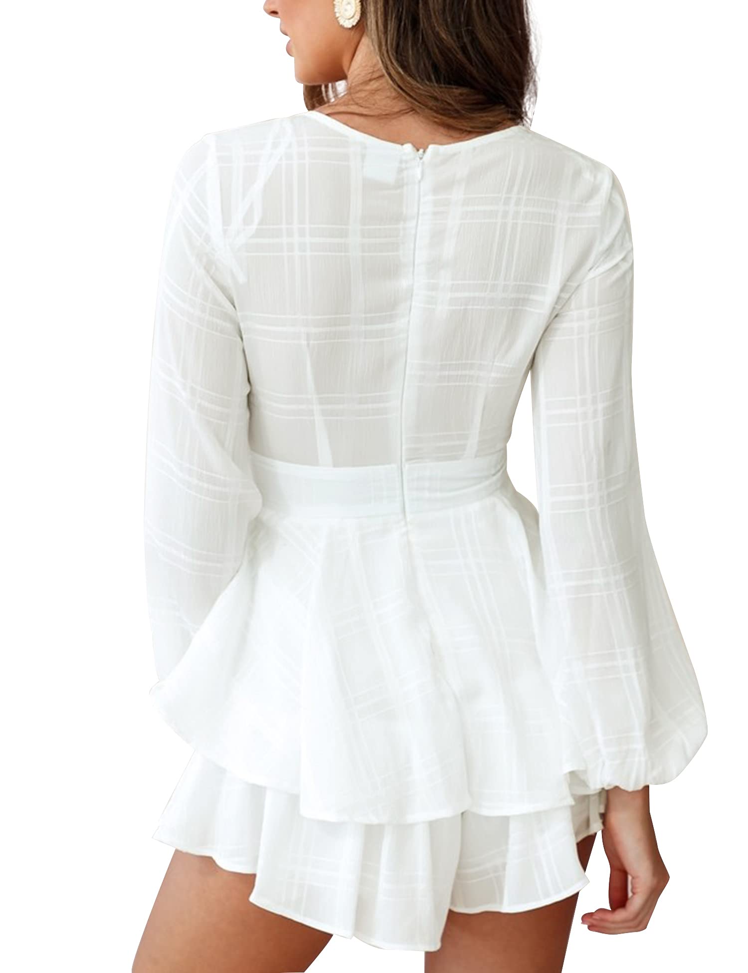 Details: Relipop Women's Romper Solid Print V Neck Baggy Sleeve Waist Tie Layered Ruffle Hem Short Casual Summer Rompers Jumpsuits