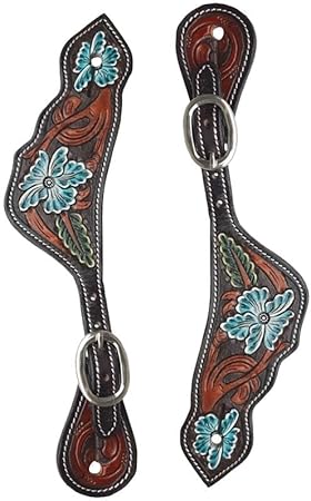 Tahoe Hand Tooled Turquoise Floral and Leaf Leather, Hand Painted Spur Straps Unisex Pair for Horse Riding, Barrel Racing and Horse Shows