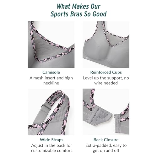 • CAMISOLE: A breathable mesh camisole design provides upper bust containment and bounce control.