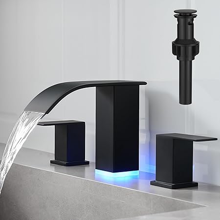 RUMOSE LED Bathroom Faucets Set Matte Black 8 inch Bathroom Sink Faucet 3 Hole with Pop Up Drain Widespread Lavatory Waterfall Vanity Faucet with 3 Colors Light Changing Stainless Steel Deck Mounted