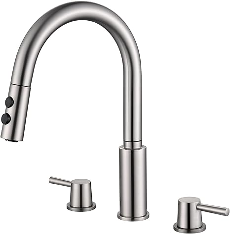 RULIA Brand, Double Handle Kitchen Faucet, 3 Holes Sink Faucet, Pull Down, Brushed Nickel, Stainless Steel, RB1063
