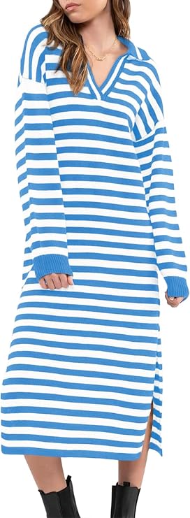 Yousify Sweater Dress for Women Long Sleeve Striped Color Block V Neck Casual Fall Dresses XS-XL