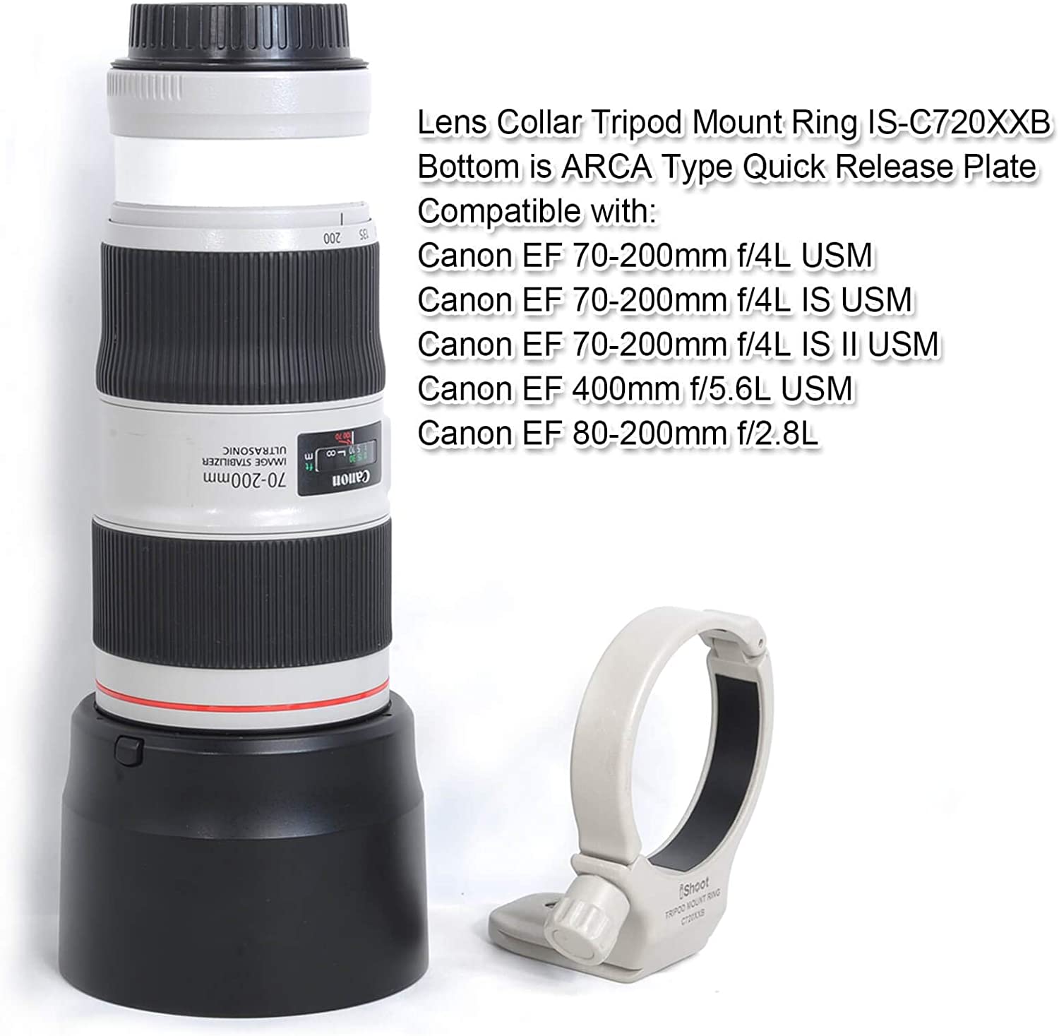 • The tripod mount ring is specially made for Canon EF 70-200mm f/4L USM Lens, Canon EF 70-200mm f/4L IS USM Lens, Canon EF 70-200mm f/4L IS II USM Lens, Canon EF 400mm f/5.6L USM Lens, Canon EF 80-200mm f/2.8L Lens;