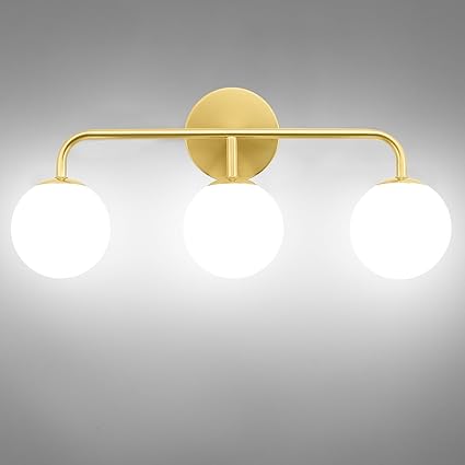 Gold Bathroom Vanity Lights, Mid Century Modern 3-Light Bathroom Lighting Fixtures Over Mirror, Brushed Gold Bathroom Lights Wall Sconce with Frosted Globe Milk Glass Shade, Wall Mount Light Fixture
