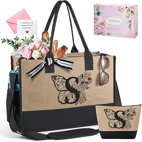 Mothers Day Gifts, Embroidery Ju-te Straw Tote Bags, Personalized Thank Grandma Sister Teacher Retirement Gifts, Ini-tial Beach Bag w Cosmetic Bag Inner Pocket Shoulder Strap Card Gift Box S