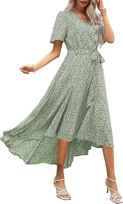 Ellakoko 2024 Women Summer High Low Dress Short Sleeve V Neck Tie Waist Flowy Ruffle Floral Maxi Dress with Pockets