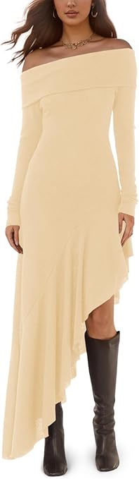 Fisoew Women's Off The Shoulder Long Sleeve Maxi Dress Fall Casual Ruffle Irregular Hem Wedding Guest Dresses