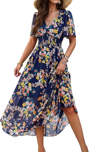 Women's Floral Maxi Dress Flowy V Neck Empire Waist Summer Wedding Guest Party Casual Chiffon Dress