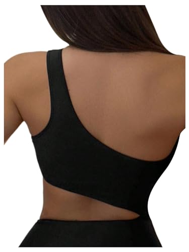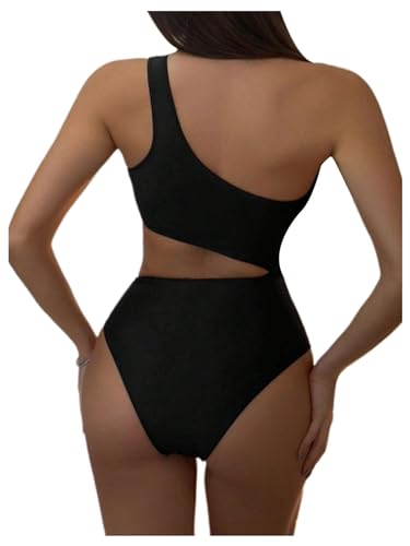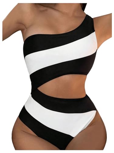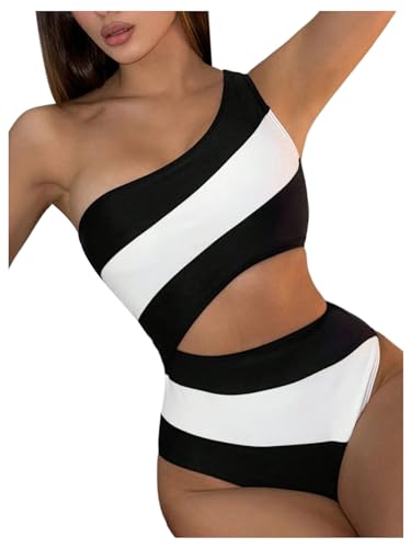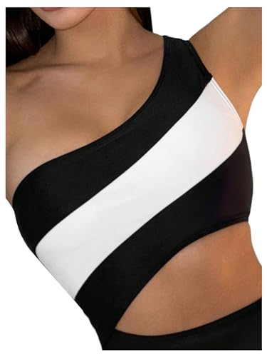 BEAUDRM Women's Colorblock One Shoulder One Piece Swimsuit Y2K Cut Out Bathing Suits Swimwear Beachwear Monokini Black and White X-Large