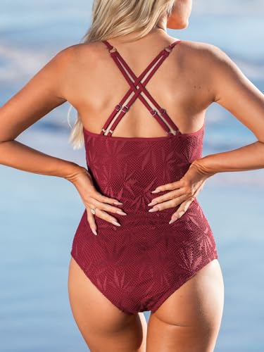 CUPSHE Women's One Piece Swimsuit Bathing Suit Scoop Neck Crisscross Adjustable Straps Cutout Mesh Cheeky M Venetian Red