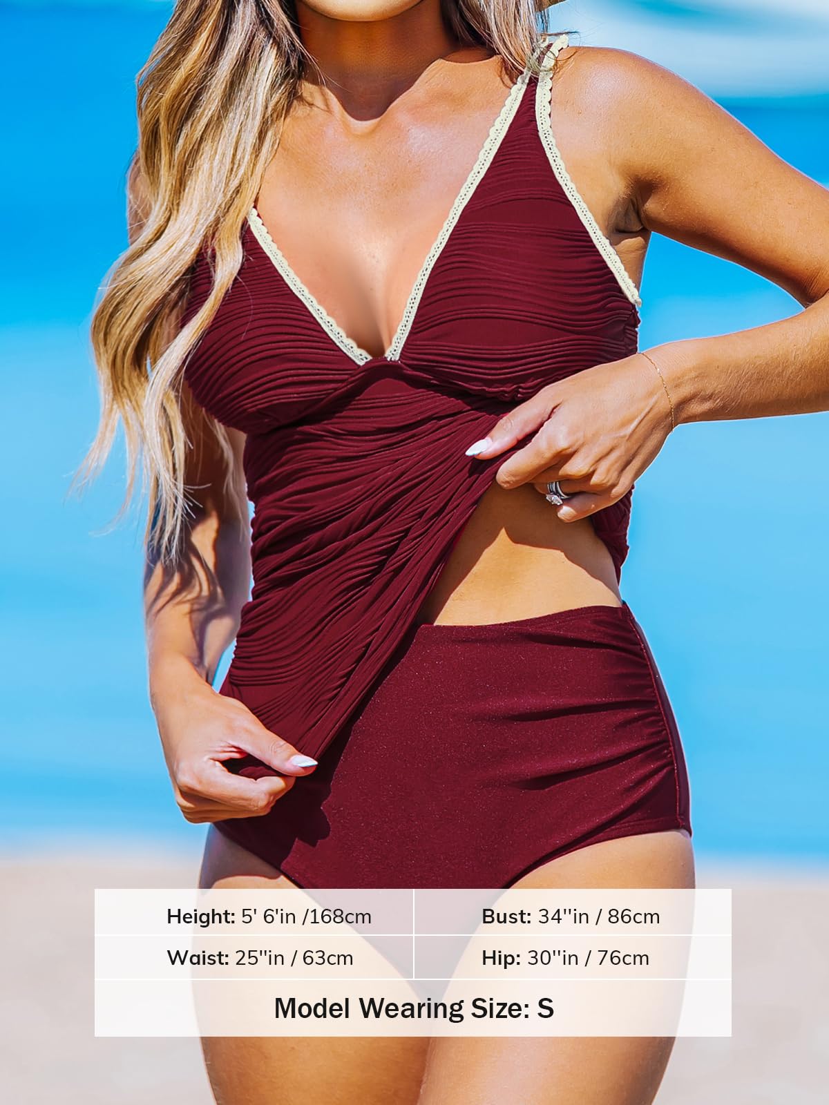 CUPSHE Women's Tankini Sets Two Piece Swimsuit High Waisted V Neck Ruched Textured Back Tie Cutout Adjustable Straps, M