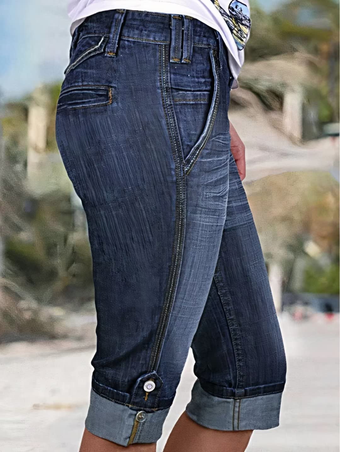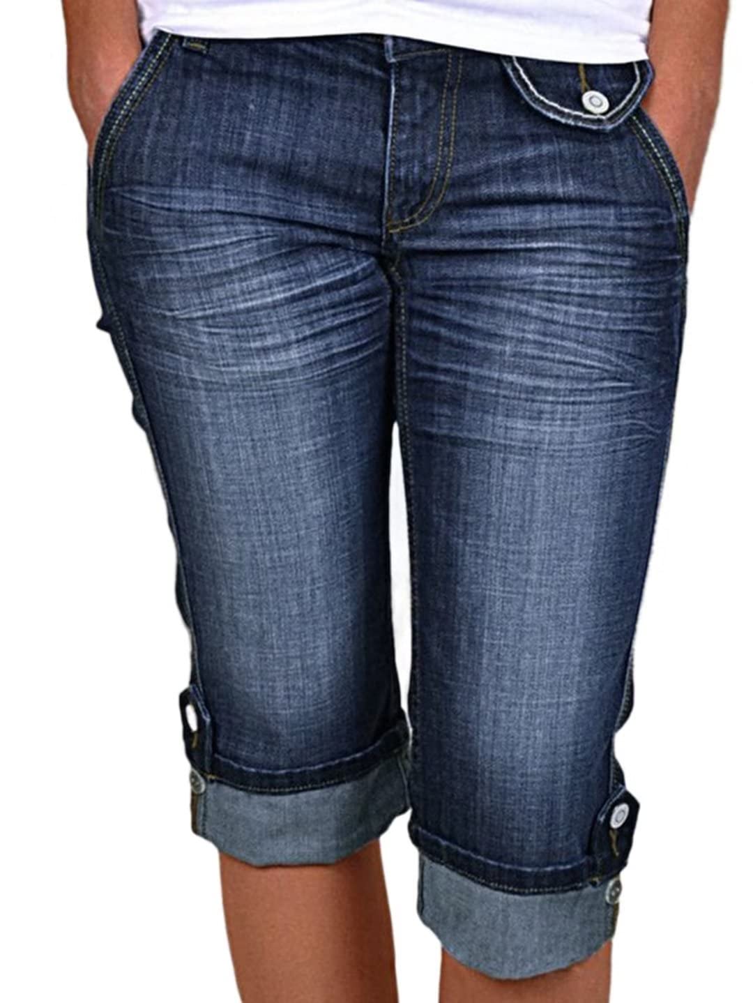 Flamingals Women's Rolled Hem Slant Pocket Capri Moto Jeans Low Waist Vintage Pants Navy Blue L