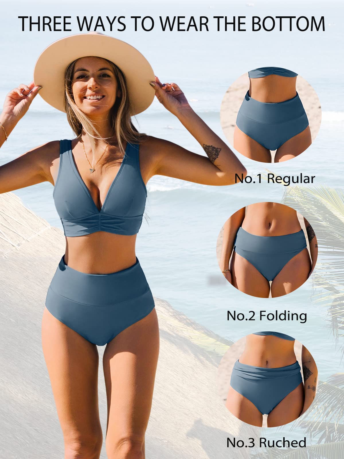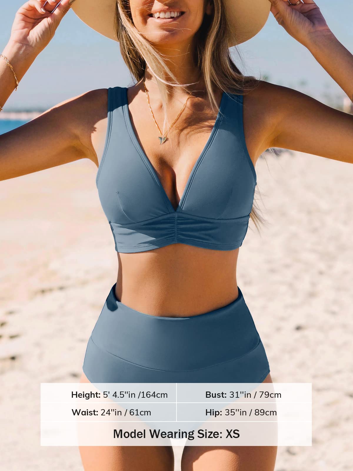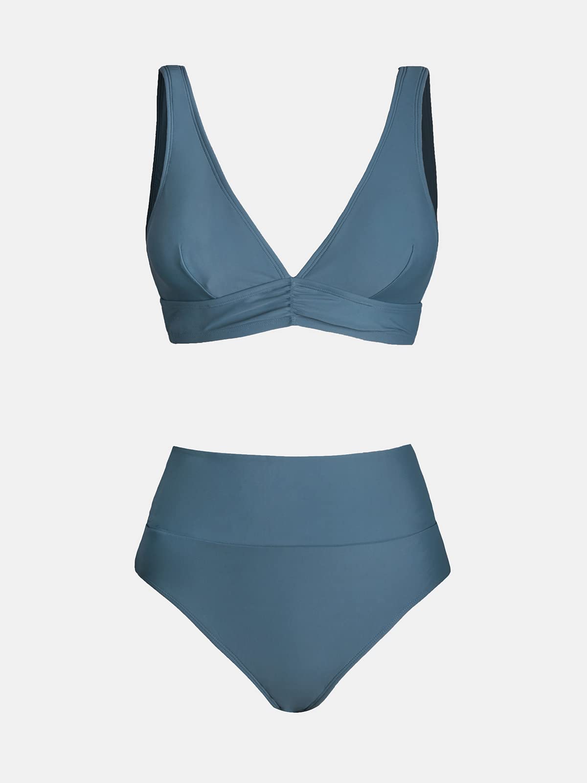 CUPSHE Bikini Set for Women Two Piece Swimsuit High Waisted V Neck Ruched Front Wide Straps L, Silver Lake Blue