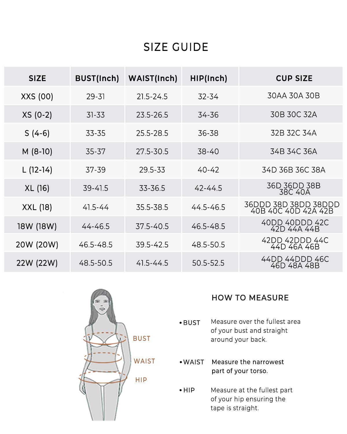 XS(US 0-2): Bust 32"-33", Waist 24"-25", Hip 34.5"-35.5"
