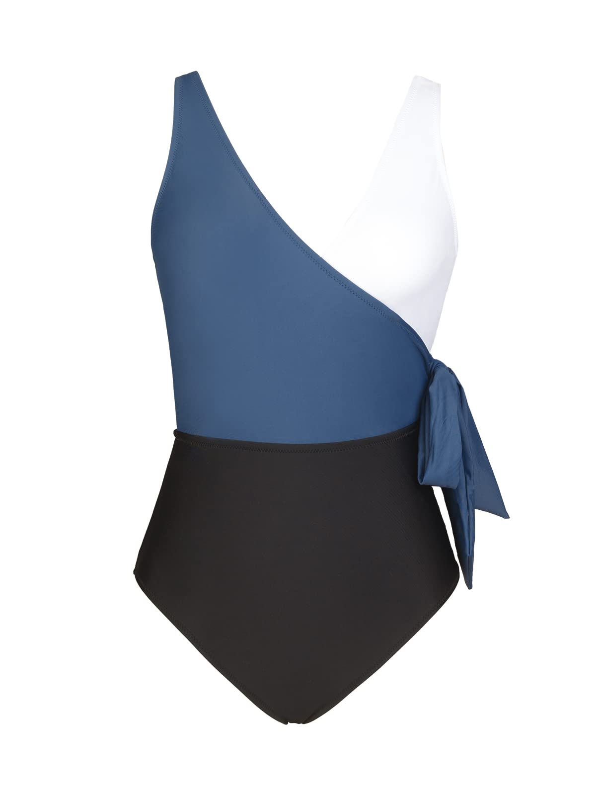 • Color Block Design One Piece Swimsuit with V-Neck and Tie Side