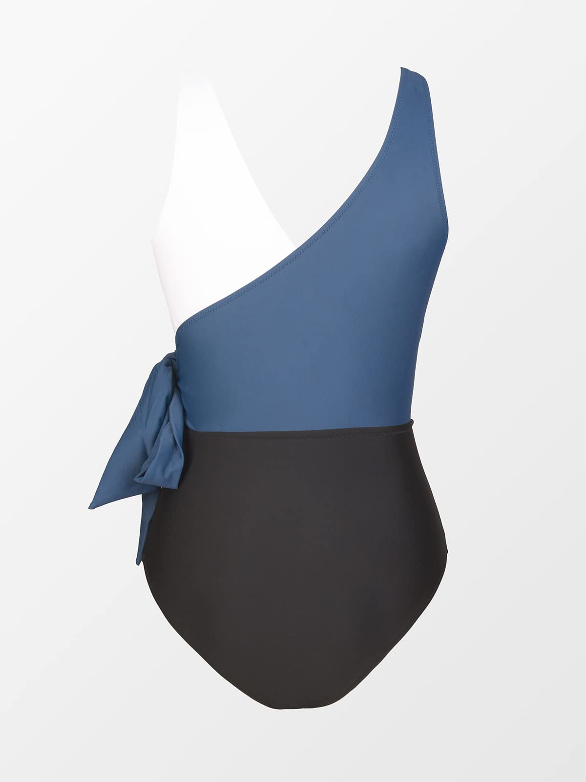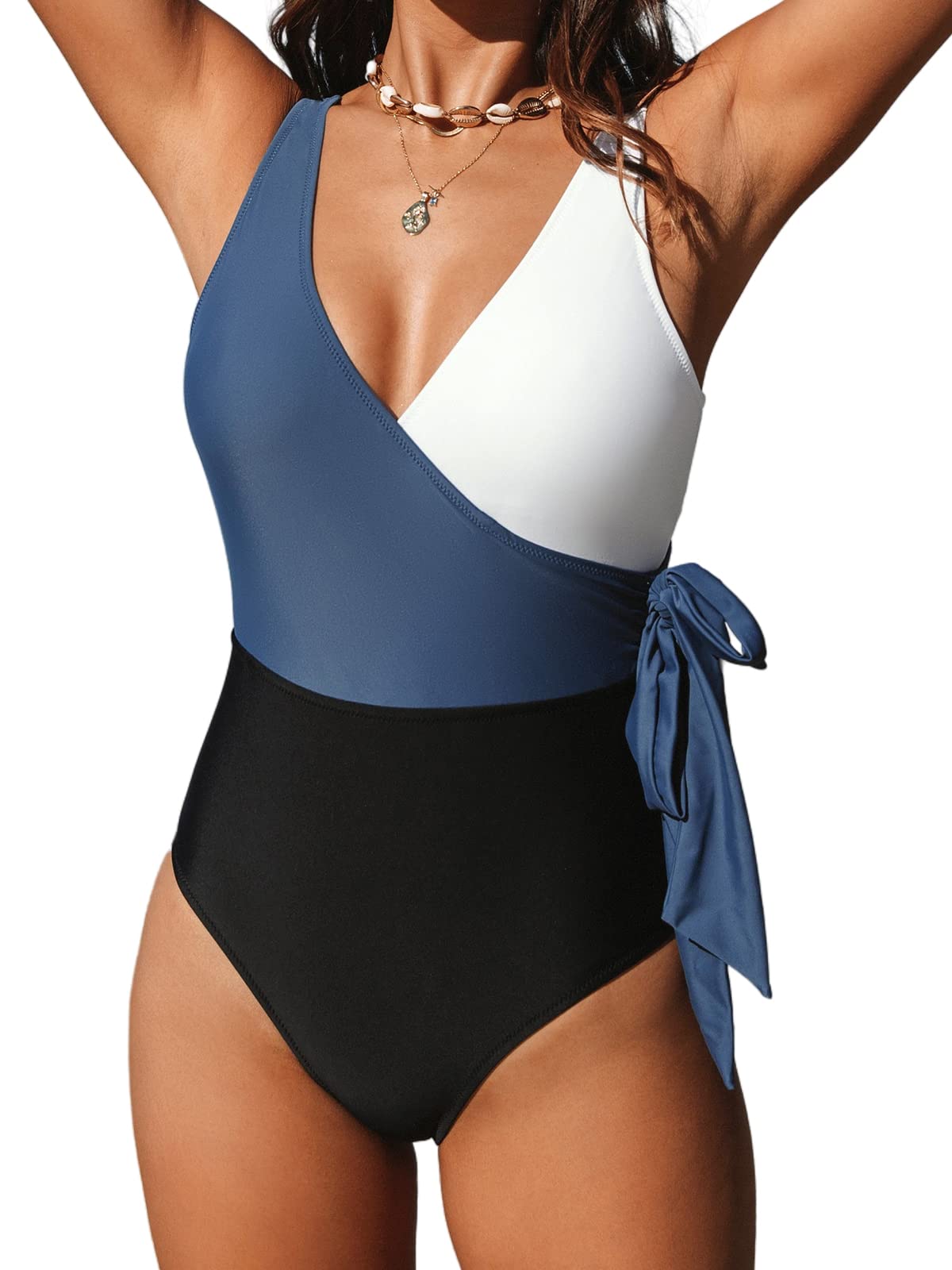 CUPSHE One Piece for Women Swimsuit Blue Tie Color Block V Neck Wrap Bathing Suit, M