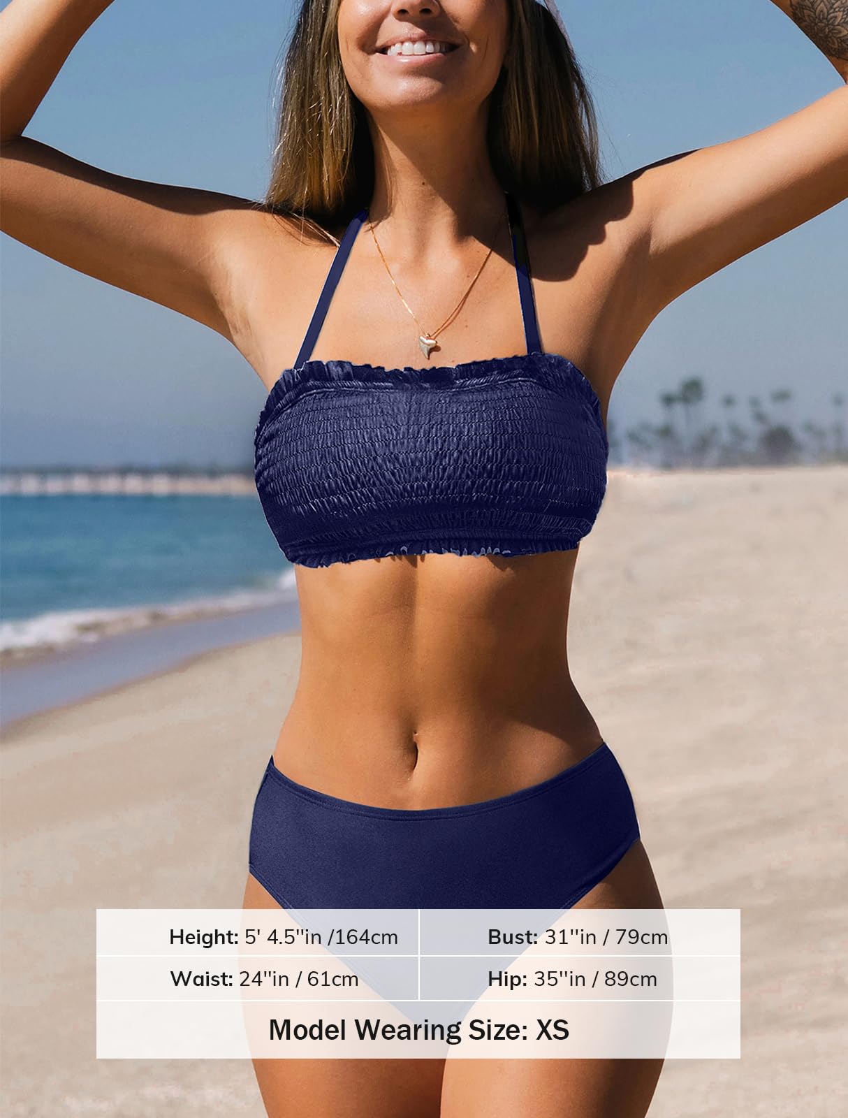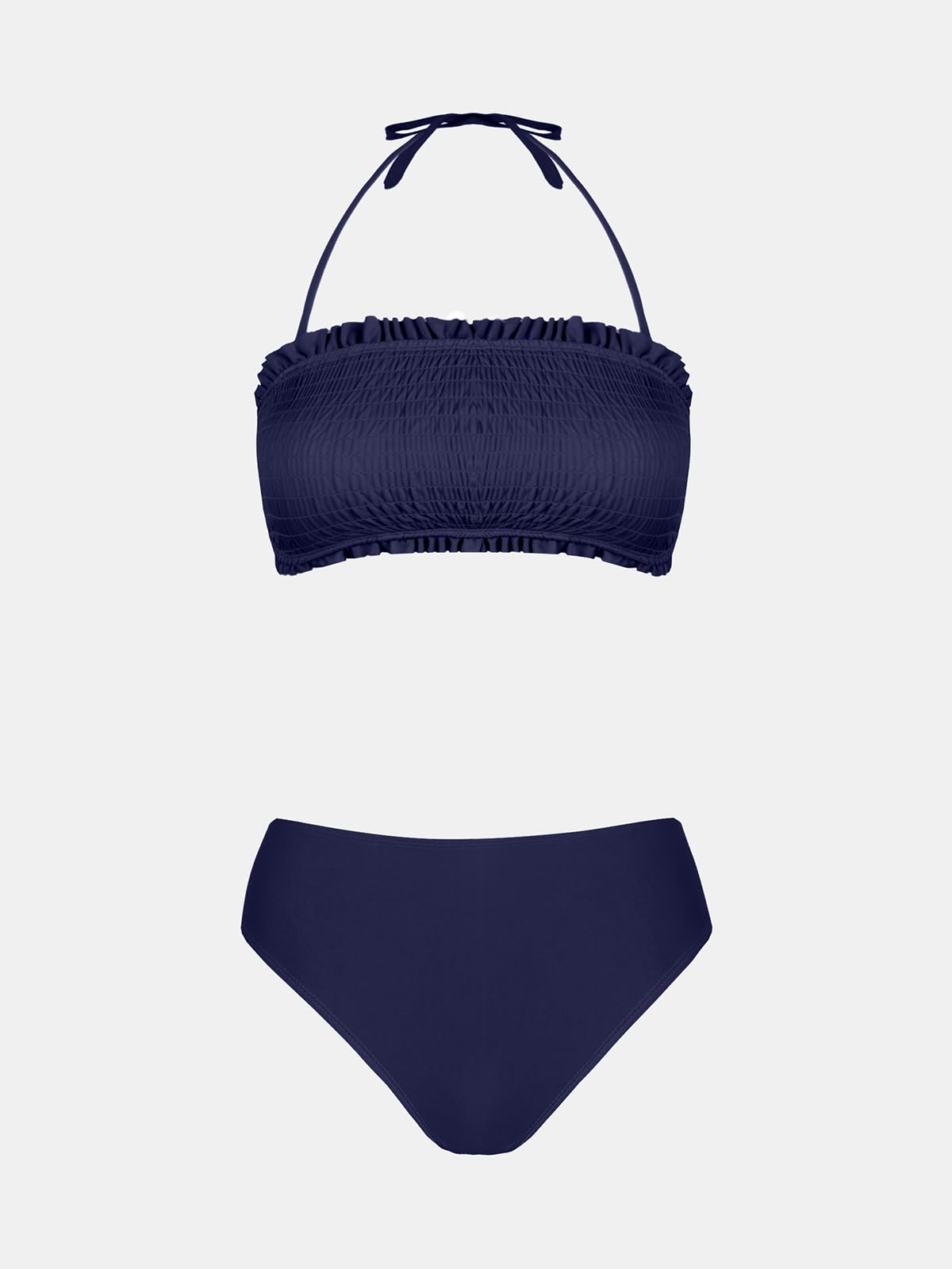 • Design: Get ready to turn heads at the beach or poolside with our Smocked Halter Top and Mid Rise Bikini Set! This stylish set features a smocked bandeau top with a merrow edge detail, adding a touch of elegance and texture. The back self tie provide a comfortable and flattering fit.