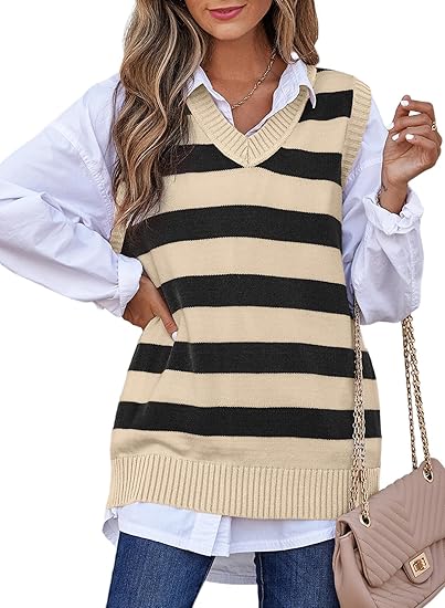 EVALESS Casual V Neck Sweater Tank Tops for Women Fall Color Block Striped Sweater Vest Knit Sleeveless Pullover Sweaters