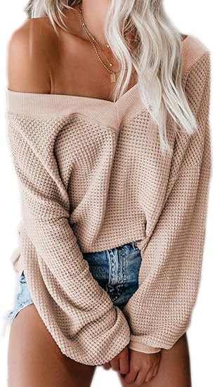 Tobrief Women's V Neck Long Sleeve Waffle Knit Tops Off Shoulder Oversized Pullover Sweater