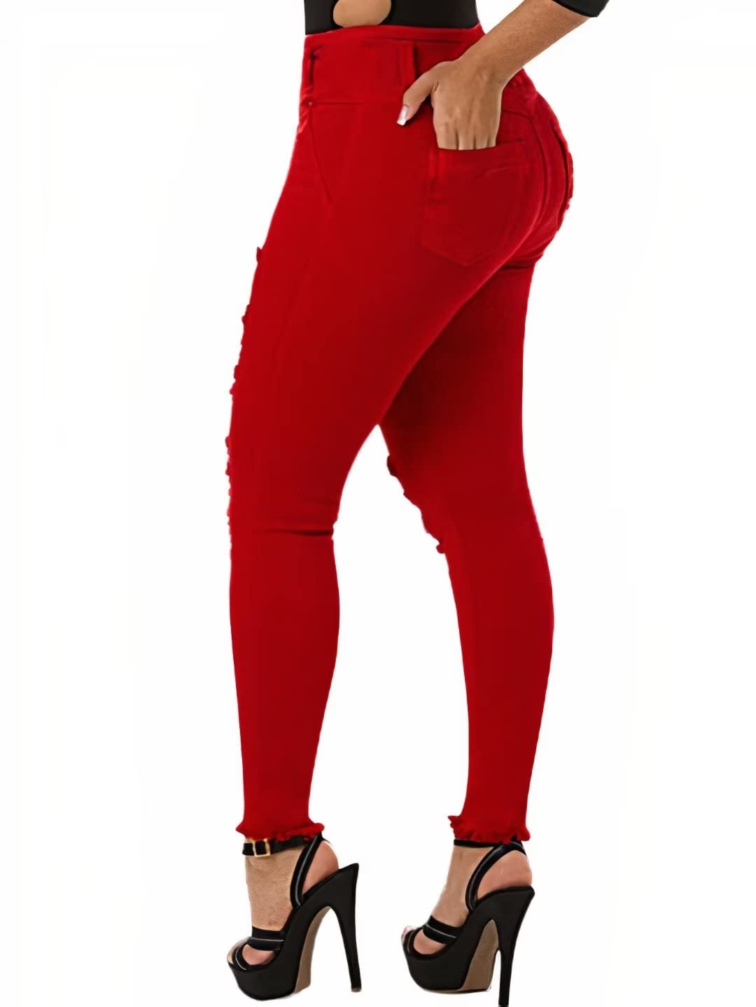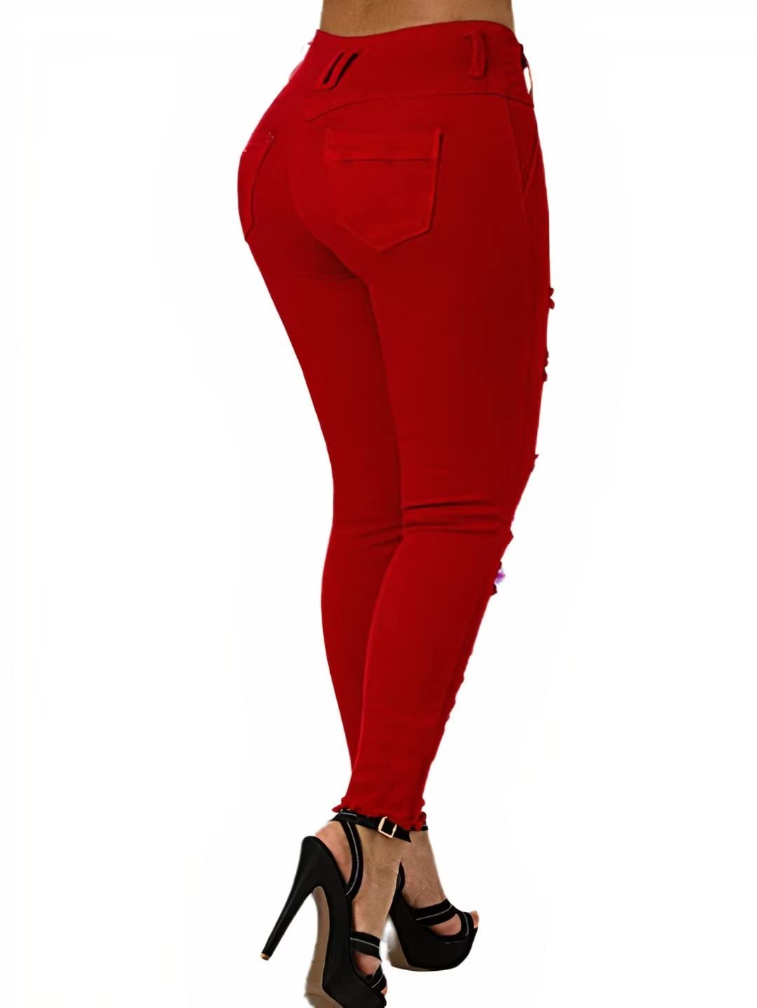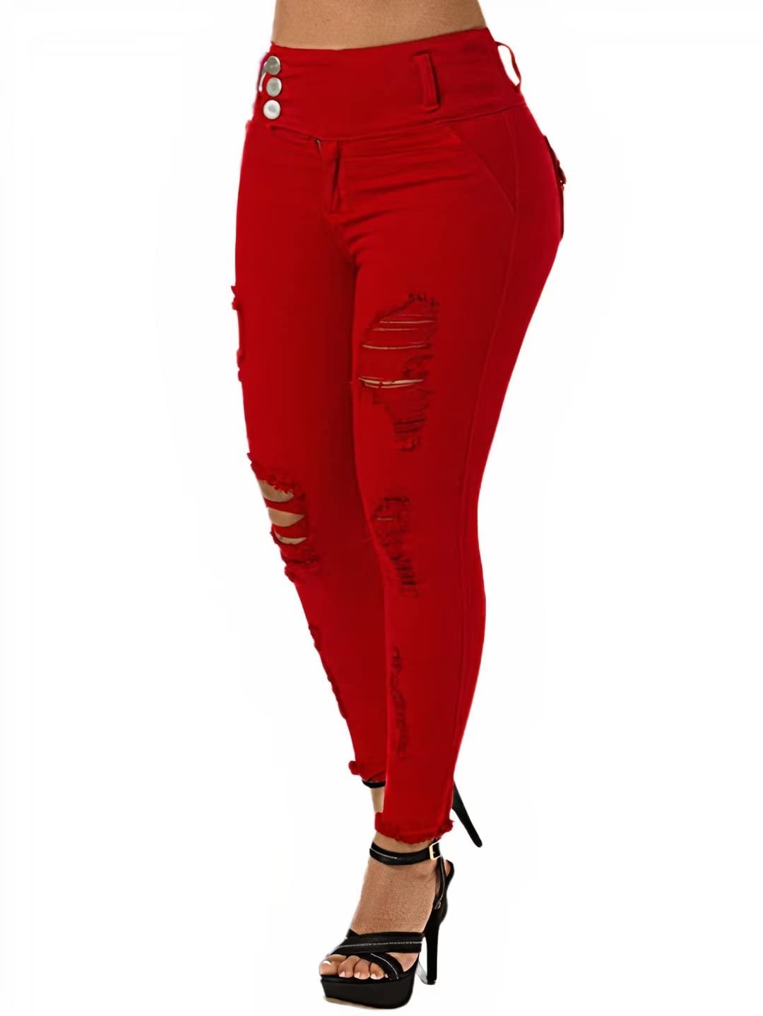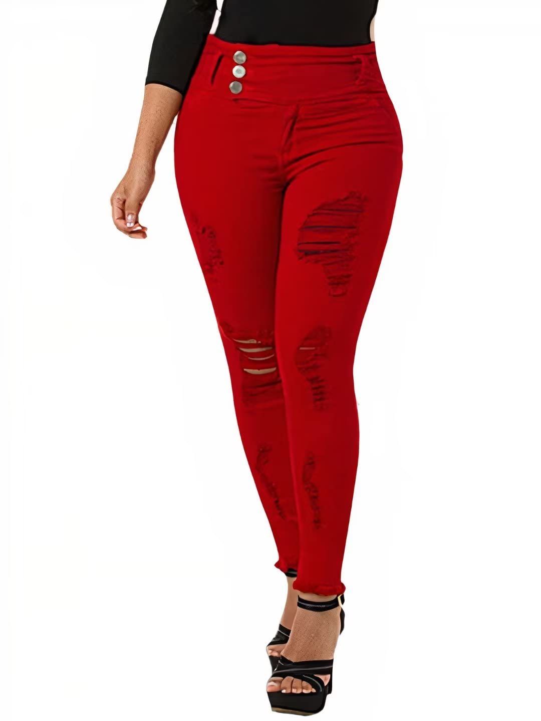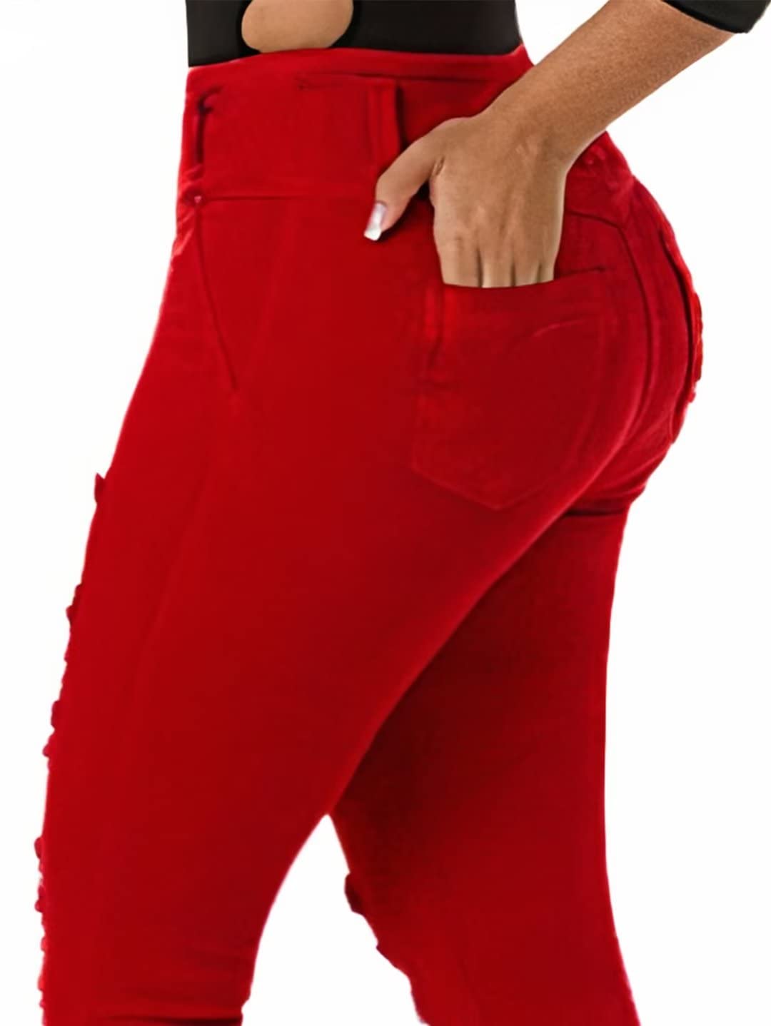 Flamingals Women's Button Cut Out Jeans High Waist Casual Pants Red