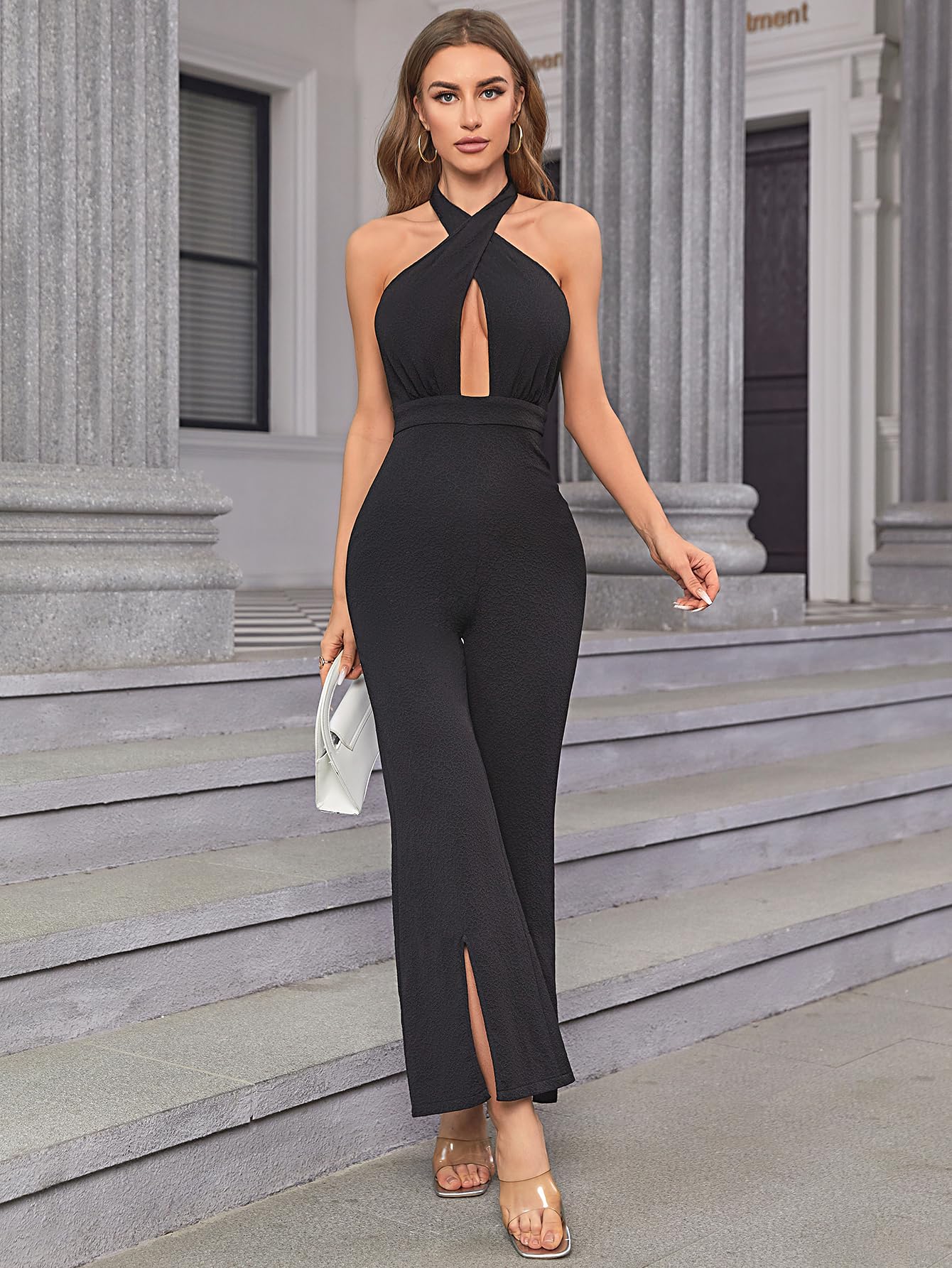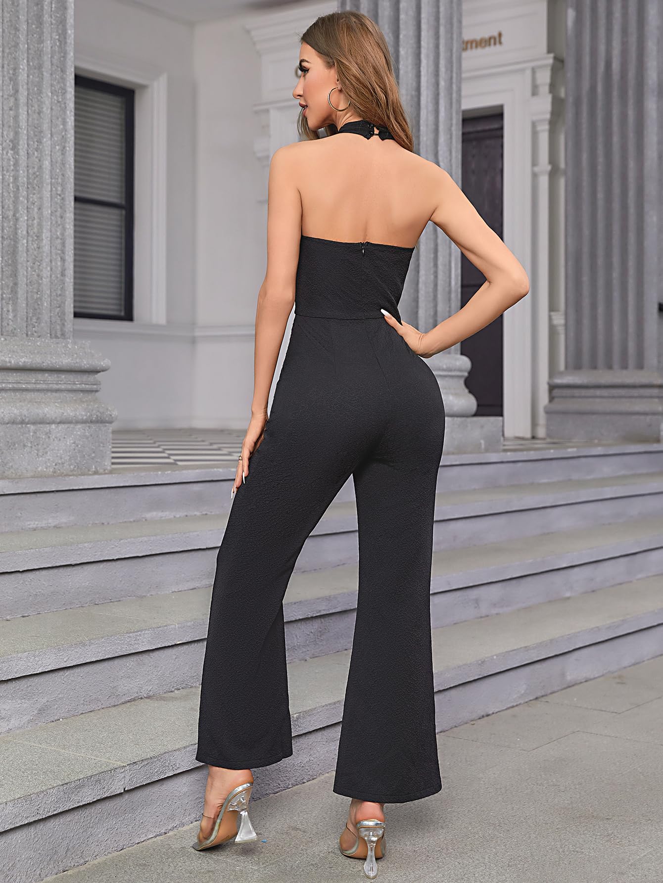 WDIRARA Women's Halter Sleeveless Cut Out Backless Long Romper Split Wide Leg High Waist Dressy Textured Jumpsuit Black S
