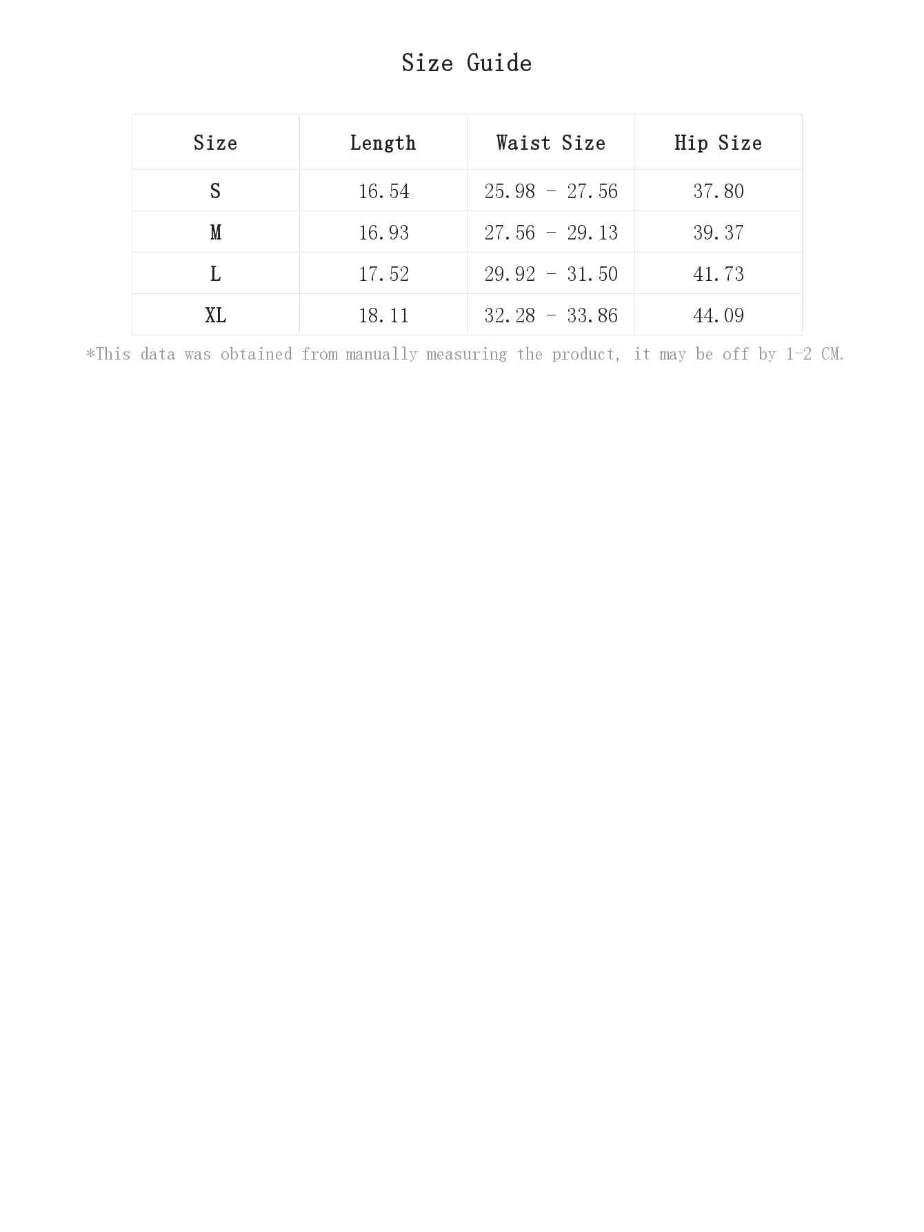 XS:Hip Size:36.6IN,Length:15.4IN,Waist Size:24.4-25.6IN