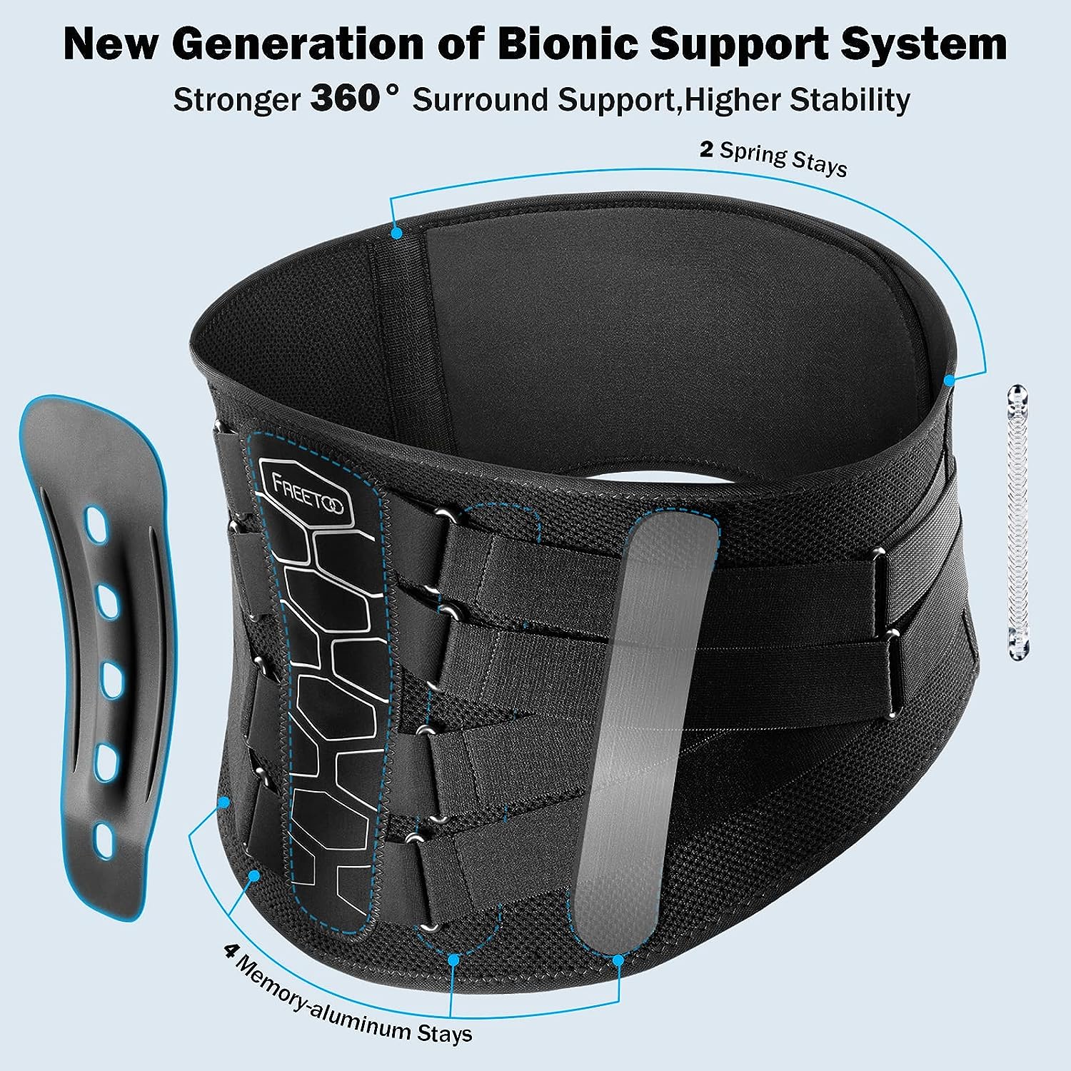 • 【THE MOST FIRM SUPPORT & STABILITY】This lower back brace adopt a new generation of ergonomic support system(1 bionic bone lumbar panel + 4 Memory-aluminum stays+ 2 flexible springs)contoured to the natural curve of the low back ,and designed to distribute pressure widely and evenly over a large area .They provide firm lower back support, stability and limit unwanted back movements that can cause lower back pain.