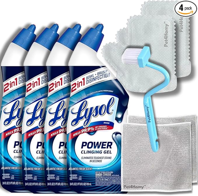 Power Toilet Bowl Cleaner Gel 4-Pack (24 Fl Oz Each) Bundle with Pair of Pet4Homy Cleaning Gloves, Cleaning Brush, and Pair of Multipurpose Wire Miracle Cleaning Cloths (4 Items)