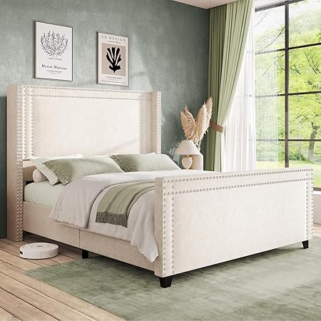 Jocisland King Size Bed Frame Chenille Upholstered Platform Bed with Nailhead Trim Wingback Headboard and Footboard, No Box Spring Needed, Cream
