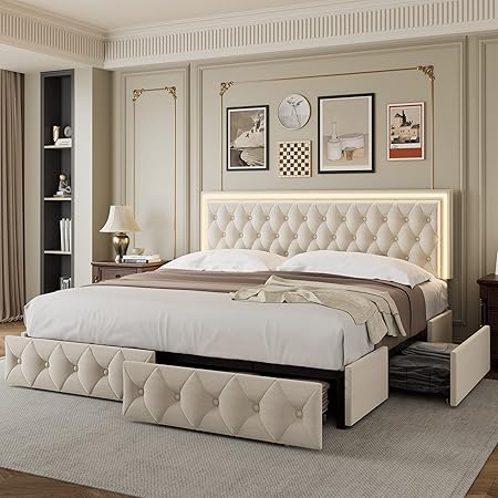 Keyluv Queen Upholstered LED Bed Frame with 4 Drawers, Velvet Platform Storage Bed with Adjustable Button Tufted Headboard and Solid Wooden Slats Support, No Box Spring Needed, Beige